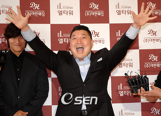개그맨 유세윤(29)이 17일 오후 서울 서초구 양재동의 한 웨딩홀에서 7년간 사랑을 키워온 4살 연상의 연인 황경희씨와 결혼식을 가진다. 비공개로 진행되는 이 날 결혼식은 현 OBS 경인TV의 대표이사이자 방송인 겸 교수인 주철환씨가 주례를 맡으며 유세윤의 절친한 친구이자 동료인 옹달샘(대학 동기시절부터 만든 희극 집단)의 장동민과 유상무가 사회를 본다. 하객으로 온 개그맨 강호동이 무릎팍 도사버전으로 축하하고 있다./민경훈 기자 rumi@osen.co.kr