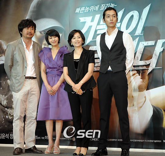 김윤석 정경호 주연의 농촌 스릴러 영화 '거북이 달린다'의 제작보고회가 18일 서울 프라자 호텔 그랜드 볼룸에서 열렸다. 신출귀몰 탈주범 송기태에게 모든 것을 빼앗긴 후 포기를 모르는 근성으로 질긴 승부를 시작하는 시골 형사 조필성의 이야기로 내달 11일 개봉 예정이다. 배우 김윤석 선우선 견미리 정경호가 포토타임을 갖고 있다./민경훈 기자 rumi@osen.co.kr