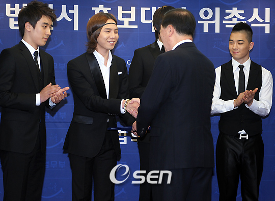 인기 남성 5인조 그룹 ‘빅뱅(Big Bang)’의 법무부 홍보대사 위촉식이 18일 오후 양재동 서울교육문화회관에서 열렸다. 앞으로 빅뱅은 법질서 캠페인과 각종 문화행사에 동참하여 우리사회에 법질서의 소중함을 널리 알리는 민간 전도사로 활동하게 될 예정이다. 빅뱅의 G-드래곤이 김경한 법무부장관에게 홍보대사 위촉장을 받고 있다./민경훈 기자 rumi@osen.co.kr