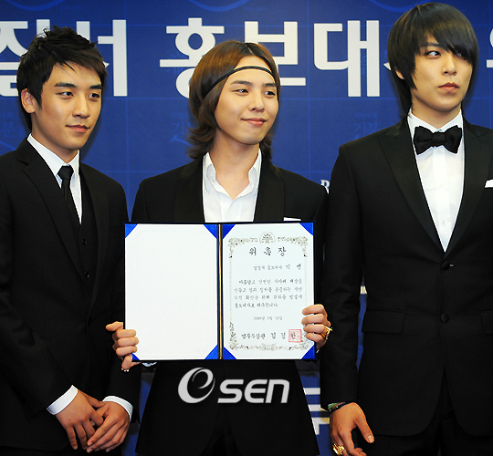 인기 남성 5인조 그룹 ‘빅뱅(Big Bang)’의 법무부 홍보대사 위촉식이 18일 오후 양재동 서울교육문화회관에서 열렸다. 앞으로 빅뱅은 법질서 캠페인과 각종 문화행사에 동참하여 우리사회에 법질서의 소중함을 널리 알리는 민간 전도사로 활동하게 될 예정이다. 빅뱅의 G-드래곤이 위촉장을 들고 포토타임을 갖고 있다./민경훈 기자 rumi@osen.co.kr