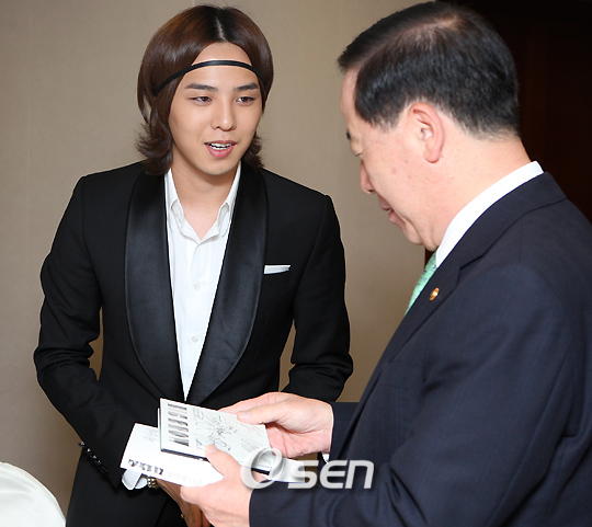 인기 남성 5인조 그룹 ‘빅뱅(Big Bang)’의 법무부 홍보대사 위촉식이 18일 오후 양재동 서울교육문화회관에서 열렸다. 앞으로 빅뱅은 법질서 캠페인과 각종 문화행사에 동참하여 우리사회에 법질서의 소중함을 널리 알리는 민간 전도사로 활동하게 될 예정이다. 빅뱅의 리더 G-드래곤이 장관과의 대화자리에서 김경한 법무부장관에게 음반과 에세이 집 '세상에 너를 소리쳐'를 선물하고 있다. /민경훈 기자 rumi@osen.co.kr