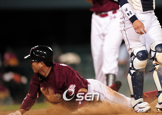 [OSEN=잠실, 박종규 객원기자] 히어로즈의 정수성(31)이 올시즌 처음으로 단독 홈스틸에 성공했다. 정수성은 27일 잠실 두산전에 중견수 겸 1번 타자로 선발 출장, 양 팀이 2-2로 맞선 5회 공격에서 홈스틸에 성공했다. 5회초 첫 타자로 들어선 정수성은 중전안타로 1루를 밟았다. 뒤이어 황재균 타석 때 2루 도루에 성공한 정수성은 황재균의 1루수 땅볼 때 3루까지 진루했다. 덕 클락이 1루수 땅볼로 물러나 맞은 2사 3루, 클리프 브룸바 타석 볼카운트 2-1에서 김선우가 5구째를 던지는 순간 정수성은 홈으로 쇄도했다. 때마침 김선우의 공이 높게 제구되며 폭투로 이어져 홈에 헤드퍼스트 슬라이딩한 정수성의 득점이 인정됐다. 정수성의 단독 홈스틸은 올시즌 처음이자 통산 22번째. 가장 최근의 기록은 지난 2007년 8월 16일 SK의 김강민이 문학 삼성전에서 기록한 것이다. '2009 CJ 마구마구 프로야구' 두산 베어스와 히어로즈의 경기가 27일 잠실 구장에서 벌어졌다. 5회초 2사 주자 3루 히어로즈 브룸바 타석때 3루 주자 정수성이 홈스틸에 성공하고 있다./잠실=민경훈 기자 rumi@osen.co.kr