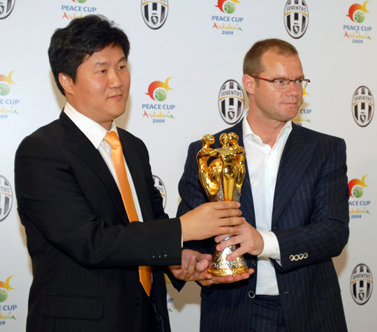 2009 피스컵에 참가하는 이탈리아 명가 유벤투스가 우승에 대한 열망을 드러냈다. 유벤투스는 지난달 30일(이하 한국시간) 이탈리아 토리노의 구단 미디어센터에서 이탈리아 기자들을 대상으로 미디어컨퍼런스를 갖고 대회 참가에 대한 각오를 밝혔다. 스포츠전문채널 스카이스포츠 등 현지 방송과 언론 매체의 뜨거운 취재열기 속에 진행된 미디어컨퍼런스에는 클라우디오 라니에리 감독의 해임으로 감독을 대신해 잔루카 페소토 매니저, 미드필더 모하메드 시소코, 수비수 올로프 멜베리가 선수를 대표해 참석했다. 유벤투스 선수 출신이기도 한 페소토는 "새로운 시즌을 앞두고 프리시즌에 참가하는 첫 대회인 피스컵은 세비야와 같은 강팀을 상대로 우리의 새로운 팀을 점검할 수 있는 좋은 기회이다"며 "축구를 통해 사회공헌 프로그램을 전개하는 대회의 의의를 잘 알고 있다"고 말했다. 우승을 기대하느냐는 질문에는 "물론 레알 마드리드 등 좋은 팀들이 참가하지만 목표는 우승이다"라고 야망을 숨기지 않았다. 이번 시즌 EPL의 아스톤 빌라에서 유벤투스로 이적해 좋은 활약을 펼친 스웨덴 대표팀 주장 올로프 멜베리는 "지난해 프리시즌에 맨체스터 유나이티드와 경기했던 것처럼 훌륭한 상대들과 경기를 통해 우리를 테스트할 좋은 기회라고 생각한다"며 "7월 안달루시아는 매우 덥지만 시즌 초반 토리노의 날씨와 비슷해 시즌 준비에 더욱 좋을 것이다"고 각오를 밝혔다. 시소코는 "좋은 취지의 대회이기도 하지만 유벤투스를 재건하는 데 매우 중요한 기회인 만큼 체력 관리에 소홀하지 않겠다”고 말했다. 시소코는 발렌시아 CF에서 뛰며 스페인 무대 경험을 가지고 있어 기대를 모으고 있다. 피스컵조직위원회를 대표해 참석한 김좌우태 부사무총장은 "세계에서 가장 유명하고 성공적인 클럽 중 하나인 유벤투스가 피스컵에 참가하게 되어 기대가 무척 크다"며 "알려진 바와 같이 피스컵의 수익금은 피스드림 프로젝트의 기금으로 사용돼 세계 각지의 스포츠 자선 활동에 쓰이게 된다”고 밝혔다. 이탈리아 클럽 최초로 피스컵에 참가하는 유벤투스는 지난 5월 26일 분데스리가 최고의 미드필러로 손꼽히는 디에구(브라질)를 2900만 유로에 영입하며 전력 보강에 나섰다. 유벤투스는 이번 피스컵에서 한국의 성남 일화, 스페인의 세비야 FC와 함께 A조에 속해 있다. 10bird@osen.co.kr 김좌우태 피스컵조직위 부사무총장-잔루카 페소토 유벤투스 매니저=피스컵 조직위 제공.