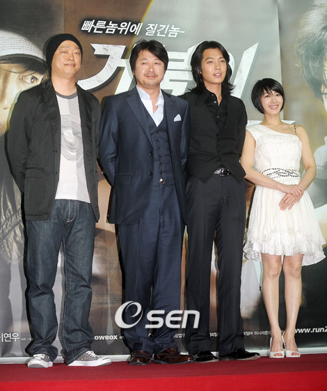 김윤석 정경호가 주연한 영화 ‘거북이 달린다’(이연구 감독) 시사회 및 기자간담회가 1일 오후 서울 동대문 메가박스에서 열렸다. '거북이 달린다’는 범죄 없는 조용한 마을 충청남도 예산을 배경으로 어느날 갑자기 나타난 신출귀몰한 탈주범(정경호 분)에게 모든 것을 빼앗긴 시골형사 조필성(김윤식 분)의 질긴 승부를 그린 농촌 액션이다. 기자간담회에 참석한 이연구 감독, 김윤석 정경호 선우선이 포토타임을 갖고 있다./윤민호 기자ymh@osen.co.kr