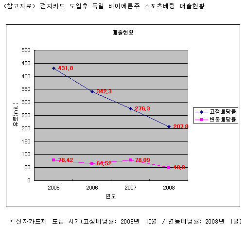 독일 바이에른주 2006년 전자카드 의무화 후 매출 절반 수준으로 급감 노르웨이, 고객 서비스 강화 차원으로 도입...대다수 국가 도입 안 해 사행산업통합감독위원회(이하 사감위)가 도입을 추진 중인 전자카드제는 독일과 노르웨이 등 일부 국가를 제외하고는 시행되고 있지 않다. 신분 노출과 개인정보 공개 등의 이유로 전자카드에 거부감을 갖고 있는 이용자들이 대거 이탈할 경우 매출액 급감이 우려되기 때문이다. 실제로 독일 분데스리가 명문구단인 '바이에른 뮌헨'이 연고지를 둔 독일 바이에른주의 경우 1996년부터 10년간 이용자 자율에 맡긴 전자카드제를 운영해 왔음에도 불구하고 현재 사감위에서 추진중인 의무적 전자카드제를 2006년 10월부터 본격 시행한 이후 매출액이 급속히 하락했다. 전자카드가 의무화되기 이전인 2005년의 경우 5억 1000만 유로에 달했던 발매액이 2008년에는 2억 5800만 유로로 절반 수준으로 떨어진 것. 상품별로는 우리나라의 프로토 게임과 같은 형태로 운영되는 고정배당률 게임(오드셋) 상품의 경우 2005년 4억3180만 유로였던 발매액이 2008년에는 2억 780만 유로로 무려 51.9%나 하락했다. 2008년 1월부터 전자카드제를 시행한 변동배당률 방식 게임(토토 방식)은 2007년 781만 유로에서 2008년 498만 유로로 불과 1년만에 36.5%의 감소율을 보였다. 독일의 경우 1인당 한주동안 베팅할 수 있는 금액이 4000유로(약 700만원)로 우리나라보다 훨씬 높은 수준임을 감안하면 전자카드제 도입이 매출 감소에 결정적 역할을 한 것으로 분석된다. 전자카드 의무화 이후 고액베팅하는 사람이 줄어드는 등 일부 긍정적 효과가 나오기도 했지만 기존 참여인원의 상당수가 전자카드 없이도 자유롭게 이용할 수 있는 해외 스포츠베팅 사이트나 불법 사설베팅시장으로 흘러들어가는 심각한 부작용을 낳고 있다. 스포츠베팅 게임에 전자카드제를 도입한 사례는 북유럽 선진국 노르웨이에서도 찾아볼 수 있다. 릴리함메르 동계올림픽으로 잘 알려진 동계스포츠 강국인 노르웨이에서는 국영 스포츠베팅사업자인 노스크티핑(Norsk-Tipping)이라는 업체가 독점적으로 사업을 운영하고 있다. 노르웨이의 경우 전체 인구 450만명 가운데 절반 가량인 210만명이 노스크티핑사의 회원으로 등록해 게임을 즐길 정도로 높은 인기를 누리고 있다. 노스크티핑이 전자카드를 도입한 목적은 사행산업을 규제하려는 것이 아니라 고객들의 편의를 강화하기 위해서다. 즉 고객들이 현금을 지참하지 않고도 어디서나 자유롭게 게임에 참여하고 적중시에는 미리 지정한 계좌로 상금을 이체해 주는 등 전적으로 고객 서비스 차원에서 전자카드가 활용된다. 현재 스포츠베팅 사업을 시행중인 나라들 가운데 이들 극소수 국가 외에는 전자카드를 도입한 사례는 거의 없다. 사감위가 추진중인 전자카드제 방식처럼 6개월 동안 55일 이상 베팅한 기록이 있으면 과다 이용객으로 분류해 전자카드가 정지되고 3시간의 교육까지 받게 하는 등 이용자들을 강력하게 규제하기 위한 장치로 활용하는 경우는 더더욱 찾아 볼 수 없다. 대다수 전문가들은 전자카드제가 우리나라에 본격 도입되면 독일처럼 스포츠토토 매출이 급감할 것으로 내다보고 있다. 전자카드제가 시행되면 스포츠토토를 구매하려는 사람은 주민등록증을 제시해 카드를 발급받은 다음 현금을 충전하는 절차를 거쳐야 한다. 게다가 언제 어디서 얼마나 구매했는지 등 모든 구매 정보가 낱낱이 기록으로 남겨진다. 이런 불편함을 무릅쓰고 게임에 참여할 사람이 과연 얼마나 될지 의문이다. 스포츠토토 사업에 정통한 한 전문가는 "외국 사례에 비춰볼 때 전자카드가 도입되면 합법사업은 위축되는 반면 불법 도박이나 인터넷 카지노 등 불법시장은 급속히 팽창하게 될 것"이라며 "아무리 좋은 명분을 갖고 추진되는 제도일지라도 효율성에 비해 부작용이 훨씬 크다면 철회하는 것이 마땅하다"고 밝혔다. '즐거운 스포츠, 즐거운 토토'(http://www.betman.co.kr)