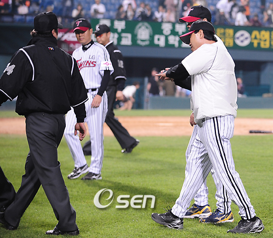 '2009 CJ 마구마구 프로야구' LG 트윈스와 한화 이글스의 경기가 2일 잠실 구장에서 벌어졌다. 이 날 경기에서 한화는 이범호의 결승 2타점 좌익수 방면 안타 등에 힘입어 9회말 상대의 거센 추격을 뿌리치고 LG에게 11-10으로 간신히 승리했다. 경기가 끝난 후 LG 김재박 감독이 9회말 2사 주자 1,2루 2-3 풀카운트에서 LG 김태완이 스윙을 하지 않았다며 항의하고 있다./잠실=민경훈 기자 rumi@osen.co.kr