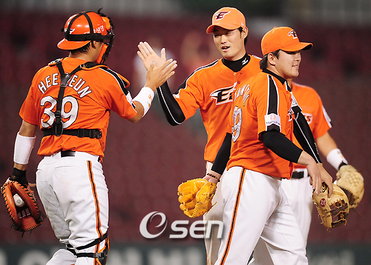 '2009 CJ 마구마구 프로야구' LG 트윈스와 한화 이글스의 경기가 2일 잠실 구장에서 벌어졌다. 이 날 경기에서 한화는 이범호의 결승 2타점 좌익수 방면 안타 등에 힘입어 9회말 상대의 거센 추격을 뿌리치고 LG에게 11-10으로 간신히 승리했다. 경기가 끝난 후 한화 선수들이 기쁨을 나누고 있다./잠실=민경훈 기자 rumi@osen.co.kr