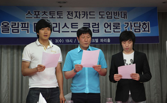 [스포츠 토토] 올림픽 금메달리스트를 비롯한 국내 스포츠 스타 플레이어들이 스포츠토토에 대한 전자카드제를 철회해야 한다는 입장을 밝혔다. 역대 올림픽 메달리스트들의 모임인 올림픽메달리스트클럽(회장 유남규)은 3일 오후 서울 방이동 올림픽파크텔에서 김영호(펜싱), 여홍철(체조), 김택수(탁구), 차동민(태권도), 송석우(쇼트트랙) 등 올림픽 메달리스트들이 참석한 가운데 체육진흥투표권(스포츠토토) 사업에 전자카드를 도입하려는 사행산업통합감독위원회(이하 사감위)의 방침에 반대한다는 내용의 성명을 발표했다. 이들은 성명서를 통해 "전자카드가 도입되면 국민체육진흥기금이 크게 감소해 올림픽에서 좋은 성적을 거둔 선수에게 주어지는 최소한의 혜택도 줄어들 수 밖에 없어 체육인 복지에 심각한 영향을 받게 되는 것은 물론이고 올림픽 무대에서 활약할 후배 체육인들의 훈련 환경도 더욱 어려워 질 것"이라고 스포츠토토를 전자카드 도입대상에서 제외해 줄 것을 호소했다. 이어 "스포츠토토를 통해 조성된 기금은 전문체육 뿐만 아니라 일반 국민을 위한 생활체육과 소외계층의 체육 지원에도 중추적인 역할을 담당하고 있음은 부정할 수 없는 사실"이라며 "합법적이고 건전한 사업 운영을 통해 체육 발전에 이바지하고 있는 스포츠토토 사업을 위축시켜 국가 체육 행정의 근간을 뒤흔들 수 있는 전자카드제는 철회하는 게 마땅하다"고 밝혔다. 1988년 서울 올림픽 탁구 금메달리스트인 유남규 감독이 회장을 맡은 올림픽메달리스트클럽은 지난해 1월 창립된 올림픽 메달리스트들의 친목 단체다. 현정화(부회장), 김영호(부회장), 김택수, 유승민, 김영호, 이봉주, 이배영, 심권호, 김수녕, 여홍철 등 역대 올림픽 메달리스트 60여명이 회원으로 활동하고 있으며 정기 모임을 통해 올림픽 메달리스트들간 친목을 도모하고 체육 발전과 사회봉사를 위한 다양한 활동을 펼치고 있다. 배구 국가대표 출신인 장윤창 경기대 교수가 대표를 맡고 있는 스포츠 스타 플레이어 모임 '함께하는 사람들'도 전자카드 반대 운동에 동참했다. 장윤창 대표 등 회원 30명은 3일 발표한 성명서에서 "스포츠토토 기금은 우리 후배 체육인들에게 젖줄과 같은 역할을 해왔다. 특히 최근에 김연아와 박태환은 체육진흥기금의 혜택을 받아 스포츠를 통해 국가 브랜드와 이미지를 향상시키는데 큰 공헌을 했다"고 밝혔다. 이들은 "사감위가 사행산업의 부작용 예방이라는 명목으로 스포츠토토 사업 등에 대해 전자카드제를 도입할 경우 스포츠토토 매출 및 지원금 감소로 이어져 결국 한국 스포츠의 지원 인프라가 붕괴하게 될 것"이라고 우려를 표명했다. 또한 "스포츠의 존립 기반을 말살하는 전자카드제는 반드시 철회돼야 함을 스포츠 가족을 대표해 천명하는 바이며 사감위는 진정한 사행산업의 사각지대가 어디인지 진지하게 고민한 후 정책을 수립하기 바란다"고 건의했다. '함께하는 사람들'은 김택수, 현정화(이상 탁구), 신태용, 김화복, 김세진, 신진식(이상 배구), 홍명보, 김도훈, 김주성(이상 축구), 문경은, 이상민(이상 농구), 마해영, 박노준(이상 야구), 김원기, 심권호(이상 레슬링), 서향순(양궁), 황충재, 장정구(이상 복싱), 전기영, 이원희(이상 유도), 문대성, 장지원, 정재은(이상 태권도), 여홍철(체조), 황영조, 이진택(이상 육상), 전이경(빙상) 등 올림픽 금메달리스트를 비롯한 스타 플레이어들이 모인 단체다. 한편 지난달에는 대한축구협회(KFA) 조중연 회장, 한국야구위원회(KBO) 유영구 총재, 한국농구연맹(KBL) 전육 총재, 한국배구연맹(KOVO) 이동호 총재, 한국여자농구연맹(WKBL) 김원길 총재, 한국프로골프협회(KPGA) 박삼구 회장, 한국여자프로골프협회(KLPGA) 선종구 회장 등 7개 스포츠 단체장이 공동으로 전자카드제 도입을 철회해 달라는 요지의 진정서를 작성해 정부와 국회 등 관련 기관에 제출하는 등 전자카드 반대 움직임이 체육계 전반으로 확산되고 있다. 올림픽메달리스트클럽 김영호 부회장(가운데)이 3일 오후 올림픽파크텔에서 스포츠토토 전자카드 도입 반대 성명서를 발표하고 있다. 왼쪽부터 차동민(태권도), 김영호(펜싱), 송석우 선수(쇼트 트랙)/스포츠 토토 제공. '즐거운 스포츠, 즐거운 토토'(http://www.betman.co.kr)