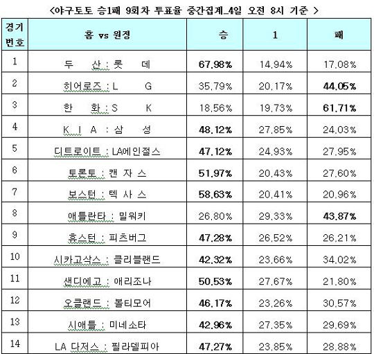 [야구토토] 국내 야구팬들은 국내프로야구 두산 베어스-롯데 자이언츠에서 두산의 우세를 전망했다. 스포츠토토 온라인 발매사이트인 베트맨(www.betman.co.kr)은 오는 5일부터 6일(이하 한국시간)까지 벌어지는 국내프로야구 4경기, 미국프로야구 MLB 10경기 등 총 14경기를 대상으로 한 야구토토 승1패 9회차 투표율 중간집계 결과 전체 참가자의 절반이 넘는 67.98%가 두산이 롯데를 누르고 선두 싸움에 유리한 고지를 차지할 것으로 내다봤다. 원정을 떠나는 롯데의 승리에 투표한 참가자는 17.08%에 머물렀고, 나머지 14.94%는 양팀의 1점차의 박빙승부를 전망했다. 이밖에 국내 프로야구에서는 LG(44.05%)와 SK(61.17%), KIA(48.12%)가 각각 히어로즈(35.79%), 한화(18.56%), 삼성(24.03%)을 상대로 우세한 경기를 펼칠 것이라는 예상이 다수를 차지했다. 미국 프로야구 MLB에서는 아메리칸리그 전통의 강호 보스턴(58.63%)이 텍사스(20.96%)을 완파하고 승리를 챙길 것으로 내다봤다. 아메리칸리그의 강자 디트로이트(47.12%)와 토론토(51.97%)는 각각 LA에인절스(27.95%)와 캔자스시티(27.60%)를 누를 것으로 전망한 팬이 많았다. 이밖에 시카고삭스(42.32%)와 시애틀(42.96%)은 클리블랜드(34.02%)와 미네소타(26.69%)에 우세한 경기를 펼칠 것으로 예상했다. 리그 1,2위를 달리고 있는 LA다저스와 필라델피아가 맞붙는 아메리칸리그에서는 홈경기를 치르는 LA다저스(47.27%)의 승리 예상이 많이 집계됐다. 이밖에 밀워키(43.87%)를 비롯해 휴스턴(47.28%)과 샌디에고(50.53%)는 각각 애틀란타(26.80%)와 피츠버그(26.21%), 애리조나(21.80%)를 상대로 승수 챙기기에 성공할 것이라는 예상이 많았다. 한편 이번 야구토토 승1패 9회차 게임은 첫번째 경기 시작 10분전인 5일 오후 6시20분에 발매를 마감한다. '즐거운 스포츠, 즐거운 토토'(http://www.betman.co.kr)
