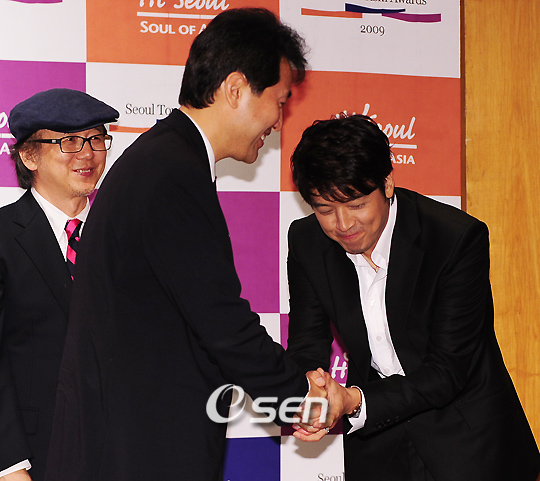 2009 서울관광대상(Seoul Tourism Awards 2009) 시상식 및 기자회견이 4일 오후 서울 신라호텔 에메랄드룸에서 열렸다. 서울관광대상에는 최고 공로자, 서울관광 언론인, 서울관광 연예인, 관광상품, 관광기업, 온라인 분야, 컨벤션, 관광 서비스 등 8개 부문 17개 본상에 걸쳐 시상이 이뤄진다. 수상자 중 류시원은 대표적인 한류스타로 한국을 지속적으로 알려온 점이 인정돼 최우수 서울 관광 연예인 상에 선정됐으며, 일본에 한국화장품 열풍을 일으킨 메이크업 아티스트 겸 방송인 잇코(본명 도요타 가즈유키)와 공동 수상의 영예를 안았다. 서울관광대상에는 송승헌과 배용준이 출연한 드라마 ‘가을동화’와 ‘겨울연가’를 연출한 윤석호 PD도 수상자 명단에 올랐다. 류시원과 오세훈 서울시장이 기자회견을 마치고 악수를 나누고 있다. /민경훈 기자 rumi@osen.co.kr