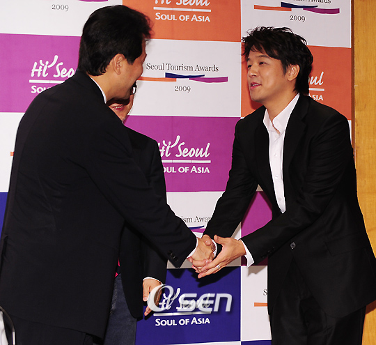 2009 서울관광대상(Seoul Tourism Awards 2009) 시상식 및 기자회견이 4일 오후 서울 신라호텔 에메랄드룸에서 열렸다. 서울관광대상에는 최고 공로자, 서울관광 언론인, 서울관광 연예인, 관광상품, 관광기업, 온라인 분야, 컨벤션, 관광 서비스 등 8개 부문 17개 본상에 걸쳐 시상이 이뤄진다. 수상자 중 류시원은 대표적인 한류스타로 한국을 지속적으로 알려온 점이 인정돼 최우수 서울 관광 연예인 상에 선정됐으며, 일본에 한국화장품 열풍을 일으킨 메이크업 아티스트 겸 방송인 잇코(본명 도요타 가즈유키)와 공동 수상의 영예를 안았다. 서울관광대상에는 송승헌과 배용준이 출연한 드라마 ‘가을동화’와 ‘겨울연가’를 연출한 윤석호 PD도 수상자 명단에 올랐다. 류시원과 오세훈 서울시장이 기자회견을 마치고 악수를 나누고 있다. /민경훈 기자 rumi@osen.co.kr