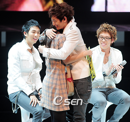 감미로운 하모니와 폭발적인 가창력으로 뜨거운 사랑을 받고 있는 4인조 남성 그룹 '2AM'이 6일 오후 서울 마포 아트센터 아트홀 맥에서 팬 미팅을 가졌다. 2008년 '이 노래'로 데뷔해 2009년 '친구의 고백'으로 큰 사랑을 받은 2AM이 팬들과 함께하는 첫 번째 팬 미팅이라 더욱 의미 있는 이번 행사는, 2AM의 팬클럽 'I AM'의 회원 중 선정된 300여명을 초청, 다양한 이벤트와 무대를 통해 팬들과 하나되는 시간을 마련했다. 2AM 멤버 중 정진운이 팬에게 드럼 스틱 선물을 준 후 포옹을 하고 있다./민경훈 기자 rumi@osen.co.kr