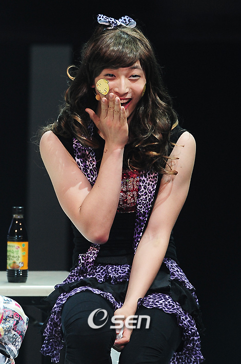 감미로운 하모니와 폭발적인 가창력으로 뜨거운 사랑을 받고 있는 4인조 남성 그룹 '2AM'이 6일 오후 서울 마포 아트센터 아트홀 맥에서 팬 미팅을 가졌다. 2008년 '이 노래'로 데뷔해 2009년 '친구의 고백'으로 큰 사랑을 받은 2AM이 팬들과 함께하는 첫 번째 팬 미팅이라 더욱 의미 있는 이번 행사는, 2AM의 팬클럽 'I AM'의 회원 중 선정된 300여명을 초청, 다양한 이벤트와 무대를 통해 팬들과 하나되는 시간을 마련했다. 2AM 정진운이 소희 분장을 하고 '어머나'를 하고 있다./민경훈 기자 rumi@osen.co.kr