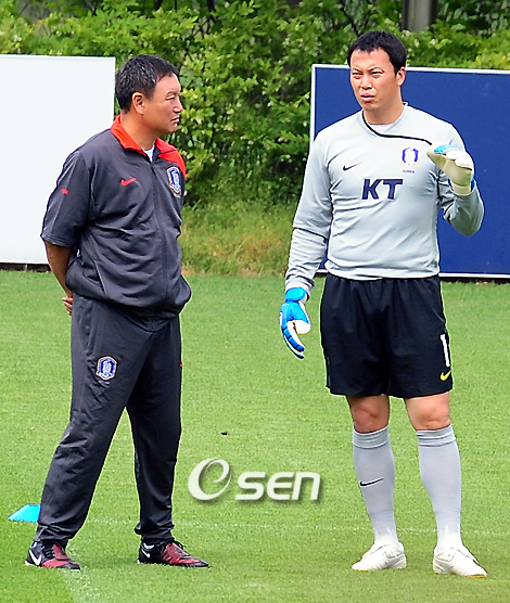 2010 남아공월드컵 아시아 최종예선 아랍에미리트연합과 어웨이 경기서 승리, 7회 연속 본선 진출의 쾌거를 이룩하고 지난 7일 귀국한 태극전사들이 10일 벌어질 사우디아라비아전에 대비, 8일 파주 NFC에서 회복훈련을 가졌다. 아랍에미리트연합전에 뛴 선수들은 가벼운 러닝과 스트레칭으로 훈련을 대신했고 나머지 선수들은 미니게임과 슈팅 훈련을 실시했다. 허정무 감독과 이운재 골키퍼가 얘기를 나누고 있다. /파주=손용호 기자spjj@osen.co.kr