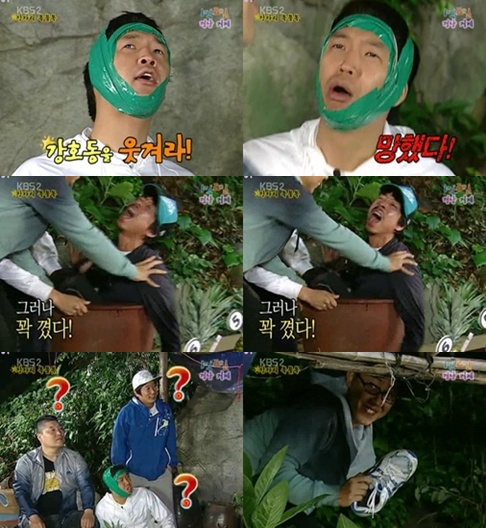 '1박 2일'이 '강호동을 웃겨라'로 웃음을 선사했다. 14일 방송된 KBS 2TV 예능프로그램 '해피선데이-1박 2일'에서는 멤버들이 경남 거제를 찾아 잠자리 복불복을 펼친 가운데, KBS 2TV '해피투게더'의 '박명수를 웃겨라' 코너를 본 딴 '강호동을 웃겨라'를 선보였다. 멤버 각자의 개성이 드러나는 개그는 강호동 뿐만 아니라 시청자들에게도 웃음을 안겼다. MC몽은 얼굴에 칭칭 청테이프를 감은 채 특유의 웃긴 표정을 지어 1등을 차지했다. 이수근은 예전 '1박 2일'에서 자체 제작한 뮤직 비디오 속의 여성 '수자'로 변신해 애교를 떨었다. 은지원은 운동화를 보고 '신봤다'라고 외치는 다소 위험한 개그를 펼쳤다. 처음에는 황당한 표정을 짓던 강호동은 곧 크게 폭소를 터뜨렸다. 김C는 통에 잘 못 들어가는 통아저씨를 흉내냈다. 의욕적인 몸개그는 아니었다고 하더라도 통에 꽉 껴서 아파하는 리얼한 표정이 웃음을 자아냈다. 이 외에도 이날 방송에서는 아침 식사 미션에서 강호동 혼자 탈락해 눈길을 끌었다. 처음에 아침 식사를 할 수 있는 깃발을 뽑은 사람은 MC몽, 김C, 이승기였지만 나중에 깃발은 MC몽, 은지원, 이수근의 손에 들려있었다. 나영석 PD는 "처음에 깃발을 잡은 사람들은 기상 미션을 충실히 수행한 사람들이고, 나중에 깃발을 차지한 사람들은 끝까지 포기하지 않은 사람들"이라고 평하며 이들 5명에게 아침 식사를 제공했다. 결국 아침에 가장 먼저 일어났지만, 동화 '토끼와 거북이'의 토끼처럼 다소 느슨한 경기를 펼친 강호동은 슬픈 표정을 지은 채 "일찍 일어나는 새가 개고생이다"며 씁쓸해 했다. nyc@osen.co.kr