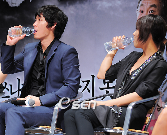 대한민국 최초의 휴먼 재난 블록버스터 영화 '해운대'의 제작보고회가 18일 오전 서울 압구정 CGV에서 열렸다. 이 자리에는 윤제균 감독과 배우 설경구 하지원 박중훈 엄정화 이민기 강예원 김인권이 참석했다. 부산 해운대에 쓰나미가 불어 닥친다는 설정으로 한치 앞을 내다볼 수 없는 쓰나미의 공포를 생생하게 담고 있다. 설경구 하지원 박중훈 엄정화 등의 쟁쟁한 출연진이 쓰나미와 처절한 사투를 벌이게 된다. 설경구와 하지원이 기자회견중 물을 마시고 있다./민경훈 기자 rumi@osen.co.kr