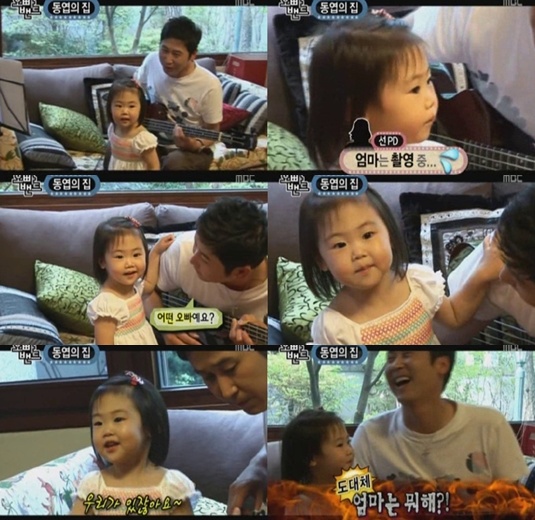 개그맨 신동엽의 딸 신지효 양의 부쩍 큰 모습이 공개됐다. 21일 방송된 MBC 예능프로그램 '일요일 일요일밤에-오빠밴드'에서는 3살 된 신지효 양이 등장해 아빠 신동엽에게 애교를 부렸다. 이날 '오빠밴드'에서 베이스를 맡은 신동엽은 집에서도 연습에 여념이 없었다. 이 때 등장한 지효 양은 "아빠 힘내세요"라는 노래를 불러 신동엽을 흐뭇케 했다. 그러면서 이 코너의 연출을 맡은 신동엽의 아내 선혜윤 PD를 두고 끊임없이 "엄마 뭐해?"라고 물어 웃음을 자아냈다. 지효 양은 지난 해 생후 11개월 당시 SBS 예능프로그램 '일요일이 좋다-체인지'에도 출연한 바 있다. 한편 이날 '퀴즈프린스' 후속으로 첫 선을 보인 '오빠 밴드'는 신동엽을 주축으로 탁재훈, 유영석, 김구라, 박현빈, 슈퍼주니어의 성민, 록밴드 트랙스의 기타리스트 김정모 등 총 7명의 멤버들의 밴드 결성기를 담아 신선한 음악 버라이어티의 재미를 안겨줬다. nyc@osen.co.kr