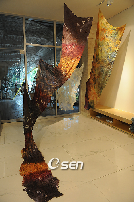 상명대 예술디자인 대학원 석사출신 디자이너들이 만든 섬유 디자인 브랜드 ‘파비스트’의 작품 전시회가 서울 강남역 인근 푸르지오 밸리 갤러리에서 열리고 있다. ‘10인 10색 시보리전’이라는 타이틀이 붙은 이번 전시(6월 22일~7월 1일)는 염색 전공 섬유작가들이 시보리 기법의 다양한 표현을 통해 현대 시보리 염색의 가능성을 점쳐보고자 만든 소통의 자리다. 사진은 홀치기 염색에 따른 주름의 생김을 인위적으로 보존시켜 입체적인 다양한 질감을 표현하고 있는 허지혜 작가의 작품(왼쪽)과 일본 전통염색의 가노코시보리 기법을 이용해 평면적인 직물에 입체적인 텍스처를 주고 주름 효과를 살린 김선영 작가의 작품이다. 파비스트 작가들은 오는 8월 12일부터 18일까지 인사동 환갤러리에서 섬유작가 전시회를 통해 다시 한번 세상과의 소통을 시도한다. /윤민호 기자 ymh@osen.co.kr