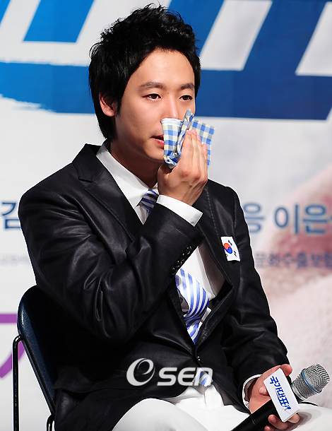 영화 국가대표 제작보고회가 29일 오후 서울 강남구 대치동 섬유센터 이벤트 홀에서 열렸다. 내달 6일 개봉 예정인 이 영화는 영화 '미녀는 괴로워'의 김용화 감독의 신작으로 자신도 제대로 추스르지 못하던 다섯 청춘들이 온 국민이 응원하는 스키점프 국가대표로 거듭나는 과정을 그렸다. 하정우, 그리고 김지석, 김동욱, 최재환, 이재응 등 실력파 루키들과 개성 있는 중견 배우 성동일이 만나 올 여름 기대작으로 화제를 모으고 있다. 김동욱이 하정우에게 빌린 손수건으로 땀을 닦고 있다./민경훈 기자 rumi@osen.co.kr