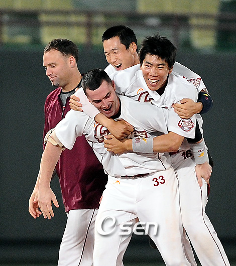 [OSEN=목동, 박종규 객원기자] 경기 후반에 빛난 히어로즈의 집중력이 두산의 철벽 마무리를 무너뜨렸다. 히어로즈는 2일 목동구장에서 열린 2009 CJ 마구마구 프로야구 두산 베어스와 경기에서 클락의 끝내기 안타에 힘입어 3-2로 승리, 3연전을 2승 1패로 마무리했다. 이날 오후까지 폭우가 쏟아져 운동장 정리 관계로 경기는 20분 늦게 시작됐다. 그래서 그런지 양 팀의 방망이가 물에 젖어 무거워지기라도 한 듯이 타선이 침묵했다. 경기 전 연습이 부족한 탓도 컸다. 따라서 투수들의 호투 보다는 타자들의 빈타라는 말이 어울리는 경기였다. 두산이 홈런으로 먼저 기세를 올렸다. 3회초 선두타자로 나선 이원석은 히어로즈 선발 김수경의 몸 쪽 높은 공을 놓치지 않고 잡아당겨 왼쪽 담장을 넘겼다. 두산에 1-0 리드를 안기는 ‘9번 타자의 한 방’ 이었다. 4회까지 이재우에게 무득점으로 눌리던 히어로즈는 5회가 되어서야 경기의 실마리를 풀었다. 1사 후 클락이 우중간을 완전히 가르는 2루타로 포문을 연 뒤, 곧이어 터진 김일경의 우중간 2루타 때 홈을 밟아 경기를 원점으로 돌렸다. 경기 중반까지도 양 팀 투수들의 호투와 타선의 침묵이 맞물렸다. 두산 선발 이재우는 낮은 코스에 위력적인 직구를 꽂아 넣으며 위기를 잘 벗어났다. 6회 2사까지 5안타 3볼넷 8삼진 1실점을 기록하며 제 몫을 다했다. 김수경 역시 노련함이 묻어나는 완급조절로 맞섰다. 이원석에게 솔로홈런을 맞은 게 아쉬웠지만, 6⅔이닝 5안타 3볼넷 1실점으로 잘 던졌다. 결정적인 한 방은 또다시 두산에서 터졌다. 8회초 1사 주자없는 상황에서 타석에 들어선 민병헌은 히어로즈의 두 번째 투수 오재영을 상대했다. 볼카운트 2-2에서 포크볼이 약간 높게 제구된 틈을 놓치지 않고 통타한 타구는 가운데 담장을 넘어갔다. 2-1로 달아나는 귀중한 홈런이었다. 민병헌의 홈런이 터지기 직전, 두산의 마운드에는 임태훈이 있었다. 임태훈은 양 팀이 1-1로 맞선 7회말 1사 1루 상황에서 뒷문을 단단히 잠그기 시작했다. 이에 힘을 얻은 두산의 방망이가 임태훈의 구원승을 위해 더욱 날카롭게 돌았다. 그러나 두산의 마무리 이용찬은 마지막 순간에 흔들렸다. 9회말 선두 타자 이숭용을 볼넷으로 내보낸 것이 화근이 됐다. 강정호의 보내기 번트 때 2루까지 진루한 이숭용은 계속된 2사 2루 상황에서 황재균의 중전안타 때 홈을 밟아 경기를 다시 원점으로 돌렸다. 아직 경기는 끝난 것이 아니었다. 2사 1루 상황에서 클락 타석 때 황재균이 과감하게 2루를 훔쳤다. 볼카운트 2-3에서 클락은 회심의 일타를 날렸다. 끝내기 좌전안타로 히어로즈의 3-2 역전승을 이끄는 순간이었다. 8회초 2사 후 등판한 송신영은 클락의 결승타에 힘입어 시즌 2승째를 거뒀다. 반면, 임태훈의 11승과 이용찬의 18세이브는 순식간에 날아갔다. '2009 CJ 마구마구 프로야구' 히어로즈와 두산 베어스 경기가 2일 목동 경기장에서 열렸다. 9회말 2사 2루 2-2 동점 상황에서 클락이 끝내기 안타를 날린후 동료들의 환영을 받고 있다./목동=김영민 기자ajyoung@osen.co.kr