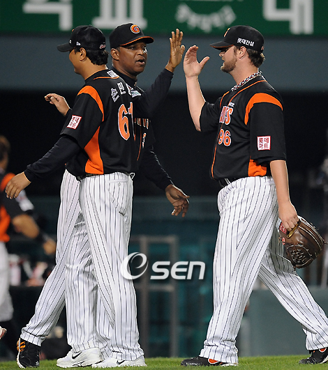 '2009 CJ 마구마구 프로야구' LG 트윈스와 롯데 자이언츠의 경기가 2일 오후 잠실구장에서 벌어졌다. 3-3으로 맞선 7회초 1타점 결승 우전 적시타를 작렬한 대타 전준우를 앞세워 롯데가 4-3으로 신승했다. 롯데는 이날 승리로 최근 2연승에 시즌 전적 37승 39패(2일 현재)를 기록하며 4위 자리를 지켰다. 롯데 로이스터 감독이 선발 손민한과 마무리 애킨스를 반갑게 맞이하고 있다./잠실=윤민호 기자ymh@osen.co.kr