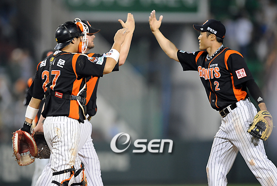 '2009 CJ 마구마구 프로야구' LG 트윈스와 롯데 자이언츠의 경기가 2일 오후 잠실구장에서 벌어졌다. 3-3으로 맞선 7회초 1타점 결승 우전 적시타를 작렬한 대타 전준우를 앞세워 롯데가 4-3으로 신승했다. 롯데는 이날 승리로 최근 2연승에 시즌 전적 37승 39패(2일 현재)를 기록하며 4위 자리를 지켰다. 승리를 거둔 롯데 선수들이 마운드에 모여 승리를 자축하고 있다./잠실=윤민호 기자ymh@osen.co.kr