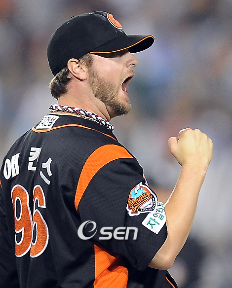 '2009 CJ 마구마구 프로야구' LG 트윈스와 롯데 자이언츠의 경기가 2일 오후 잠실구장에서 벌어졌다. 3-3으로 맞선 7회초 1타점 결승 우전 적시타를 작렬한 대타 전준우를 앞세워 롯데가 4-3으로 신승했다. 롯데는 이날 승리로 최근 2연승에 시즌 전적 37승 39패(2일 현재)를 기록하며 4위 자리를 지켰다. 9회말 2사 1,2루 위기 상황을 넘긴 롯데 애킨스가 환호하고 있다./잠실=윤민호 기자ymh@osen.co.kr