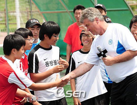 세계적인 명장 거스 히딩크 (Gus hiddink, 62)와 이영표(32, 도르트문트) 선수가 참여한 '나이키 파이브 5대5 축구 클리닉' 행사가 4일 오후 경기도 용인시 축구센터에서 열렸다. 이번 축구 클리닉에서 히딩크 감독은 5대5 경기의 승부를 결정지을 수 있는 네 가지 기술인 '터치, 정확성, 스피드, 민첩성'을 키우기 위한 훈련을 실시함과 동시에 축구 꿈나무들에게 훌륭한 축구선수가 되기 위한 희망과 격려의 메시지도 전달했다. 또한 히딩크 감독은 이영표 선수와 함께 각각 5명으로 이루어진 팀을 맡아 승부를 겨뤄 스승과 제자 사이에 흥미지진한 코칭 대결을 펼쳤다. 히딩크감독이 자신이 맡은 팀과 악수를 나누고 있다./용인=민경훈 기자 rumi@osen.co.kr