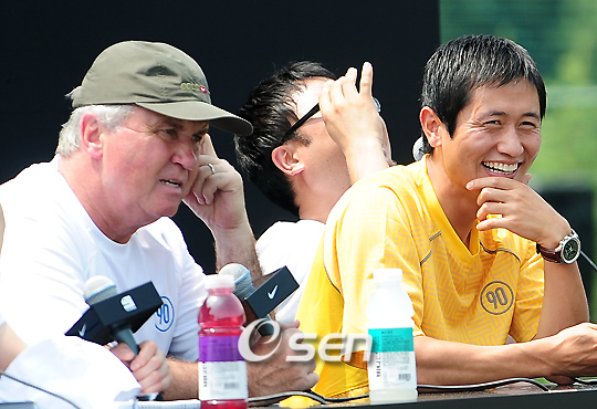 세계적인 명장 거스 히딩크 (Gus hiddink, 62)와 이영표(32, 도르트문트) 선수가 참여한 '나이키 파이브 5대5 축구 클리닉' 행사가 4일 오후 경기도 용인시 축구센터에서 열렸다. 이번 축구 클리닉에서 히딩크 감독은 5대5 경기의 승부를 결정지을 수 있는 네 가지 기술인 '터치, 정확성, 스피드, 민첩성'을 키우기 위한 훈련을 실시함과 동시에 축구 꿈나무들에게 훌륭한 축구선수가 되기 위한 희망과 격려의 메시지도 전달했다. 또한 히딩크 감독은 이영표 선수와 함께 각각 5명으로 이루어진 팀을 맡아 승부를 겨뤄 스승과 제자 사이에 흥미지진한 코칭 대결을 펼쳤다. 히딩크 감독과 이영표 선수가 각자 자신의 꿈나무 팀 경기를 보며 상반된 표정을 짓고 있다./용인=민경훈 기자 rumi@osen.co.kr