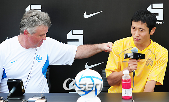 세계적인 명장 거스 히딩크 (Gus hiddink, 62)와 이영표(32, 도르트문트) 선수가 참여한 '나이키 파이브 5대5 축구 클리닉' 행사가 4일 오후 경기도 용인시 축구센터에서 열렸다. 이번 축구 클리닉에서 히딩크 감독은 5대5 경기의 승부를 결정지을 수 있는 네 가지 기술인 '터치, 정확성, 스피드, 민첩성'을 키우기 위한 훈련을 실시함과 동시에 축구 꿈나무들에게 훌륭한 축구선수가 되기 위한 희망과 격려의 메시지도 전달했다. 또한 히딩크 감독은 이영표 선수와 함께 각각 5명으로 이루어진 팀을 맡아 승부를 겨뤄 스승과 제자 사이에 흥미지진한 코칭 대결을 펼쳤다. 대결과 훈련을 마친 후 가진 인터뷰에서 이영표 선수가 자신의 팀이 히딩크 감독 팀을 꺾을 소감을 말했다. 소감 중 이영표 선수가 농담으로 히딩크 감독을 꺾은 자신은 이제 더 이상의 목표가 없기 때문에 코치를 은퇴하겠다고 하자 히딩크 감독이 옆에서 주먹으로 때리고 있다./용인=민경훈 기자 rumi@osen.co.kr