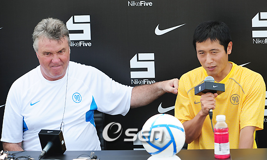 세계적인 명장 거스 히딩크 (Gus hiddink, 62)와 이영표(32, 도르트문트) 선수가 참여한 '나이키 파이브 5대5 축구 클리닉' 행사가 4일 오후 경기도 용인시 축구센터에서 열렸다. 이번 축구 클리닉에서 히딩크 감독은 5대5 경기의 승부를 결정지을 수 있는 네 가지 기술인 '터치, 정확성, 스피드, 민첩성'을 키우기 위한 훈련을 실시함과 동시에 축구 꿈나무들에게 훌륭한 축구선수가 되기 위한 희망과 격려의 메시지도 전달했다. 또한 히딩크 감독은 이영표 선수와 함께 각각 5명으로 이루어진 팀을 맡아 승부를 겨뤄 스승과 제자 사이에 흥미지진한 코칭 대결을 펼쳤다. 대결과 훈련을 마친 후 가진 인터뷰에서 이영표 선수가 자신의 팀이 히딩크 감독 팀을 꺾을 소감을 말했다. 소감 중 이영표 선수가 농담으로 히딩크 감독을 꺾은 자신은 이제 더 이상의 목표가 없기 때문에 코치를 은퇴하겠다고 하자 히딩크 감독이 옆에서 주먹으로 때리고 있다./용인=민경훈 기자 rumi@osen.co.kr