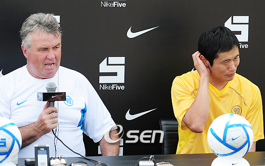 세계적인 명장 거스 히딩크 (Gus hiddink, 62)와 이영표(32, 도르트문트) 선수가 참여한 '나이키 파이브 5대5 축구 클리닉' 행사가 4일 오후 경기도 용인시 축구센터에서 열렸다. 이번 축구 클리닉에서 히딩크 감독은 5대5 경기의 승부를 결정지을 수 있는 네 가지 기술인 '터치, 정확성, 스피드, 민첩성'을 키우기 위한 훈련을 실시함과 동시에 축구 꿈나무들에게 훌륭한 축구선수가 되기 위한 희망과 격려의 메시지도 전달했다. 또한 히딩크 감독은 이영표 선수와 함께 각각 5명으로 이루어진 팀을 맡아 승부를 겨뤄 스승과 제자 사이에 흥미지진한 코칭 대결을 펼쳤다. 대결과 훈련을 마친 후 가진 인터뷰에서 히딩크 감독이 승부에 대한 소감을 말하자 이영표 선수가 머리를 긁적이고 있다./용인=민경훈 기자 rumi@osen.co.kr