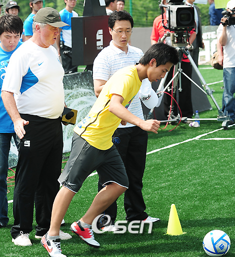 세계적인 명장 거스 히딩크 (Gus hiddink, 62)와 이영표(32, 도르트문트) 선수가 참여한 '나이키 파이브 5대5 축구 클리닉' 행사가 4일 오후 경기도 용인시 축구센터에서 열렸다. 이번 축구 클리닉에서 히딩크 감독은 5대5 경기의 승부를 결정지을 수 있는 네 가지 기술인 '터치, 정확성, 스피드, 민첩성'을 키우기 위한 훈련을 실시함과 동시에 축구 꿈나무들에게 훌륭한 축구선수가 되기 위한 희망과 격려의 메시지도 전달했다. 또한 히딩크 감독은 이영표 선수와 함께 각각 5명으로 이루어진 팀을 맡아 승부를 겨뤄 스승과 제자 사이에 흥미진진한 코칭 대결을 펼쳤다. 히딩크 감독이 직접 꿈나무들의 훈련을 코치하고 있다./용인=민경훈 기자 rumi@osen.co.kr