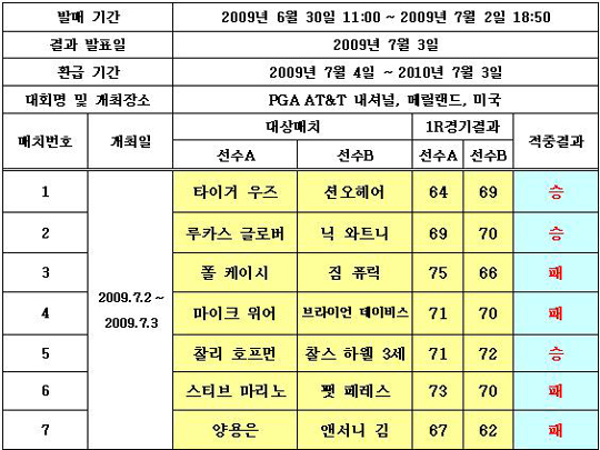 [골프토토] PGA AT&T 내셔널 1라운드를 대상으로 한 골프토토 승무패 24회차 게임에서 총 412명의 적중자가 나왔다. 체육진흥투표권 수탁사업자인 스포츠토토(www.sportstoto.co.kr)는 지난 2일 미국 릴렌드에서 펼쳐진린 미국프로골프(PGA)투어 PGA AT&T 내셔널 1라운드를 대상으로 한 골프토토 승무패 24회차 게임에서 7개 매치를 정확히 맞힌 참가자가 총 214명 나와 각각 베팅금액의 65.1배에 해당하는 적중상금을 가져가게 됐다고 밝혔다. 상금랭킹 순으로 14명을 선정, 2명씩 7개 매치로 나눠 각 매치별로 1라운드 최종 승-무-패를 예상하는 방식으로 진행된 이번 게임에서 타이거 우즈-션오헤어(승), 루카스 글로버-닉 와트니(승), 폴 케이시-짐 퓨릭(패), 마이크 위어-브라이언 데이비스(패), 찰리 호프먼-찰스 하웰3세(승), 스티브 마리노-펫 페레스(패), 양용은-앤서니 김(패) 등의 결과가 나왔다. 각 매치의 승-무-패를 정확히 맞힌 적중자들 가운데 5만원을 베팅한 1명의 골프팬 들은 이번 회차 최고액인 325만 5,000원 적중상금을 가져가는 됐다. 또한 최소 베팅액인 100원을 베팅한 210명의 적중자들에게는 각각 6510원의 적중상금이 각각 지급된다. 한편 다음회차인 골트토토 승무패 43회차는 9일 미국 펜실베니아에서 개최되는 LPGA US여자 오픈을 대상으로 발행될 예정이다. '즐거운 스포츠, 즐거운 토토'(http://www.betman.co.kr)