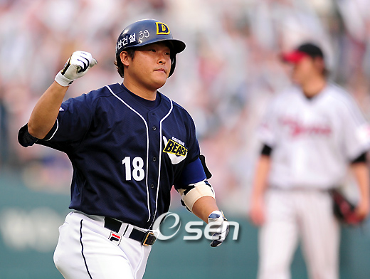 '주포' 김동주(33. 두산 베어스)가 사상 처음으로 잠실 구장 100홈런 타자가 되었다. 김동주는 5일 잠실 구장서 벌어진 LG와의 경기에 4번 타자 겸 3루수로 선발 출장, 0-4로 뒤진 6회초 무사 1루서 상대 선발 릭 바우어(32)의 3구 째를 밀어쳐 우측 담장을 넘기는 2점 홈런을 작렬했다. 이 홈런은 올 시즌 자신의 9호 홈런이자 통산 223번째 홈런인 동시에 사상 최초의 잠실 100홈런이다. 김동주에 이어 잠실서 가장 많은 홈런을 때려낸 타자는 지난 1998년부터 2002년까지 두산서 활약한 우타 거포 타이론 우즈(40. 전 주니치)로 90개의 아치를 잠실서 쏘아올렸다. 또한 지난 시즌 후 전격 은퇴를 선언했던 '헤라클레스' 심정수(34. 전 삼성)는 총 76개의 잠실 구장 홈런을 기록했다. MBC-LG 소속으로 잠실서 가장 많은 홈런을 때려낸 타자는 '적토마' 이병규(35. 현 주니치)로 56개의 홈런을 잠실서 기록했으며 2위는 47개를 기록한 조인성(34. LG)이다. 또한 LG를 거쳤던, 현재 타 구단에 소속된 선수들 중 '캐넌히터' 김재현(34. SK)은 잠실 63홈런을 기록 중이며 김동수(41. 히어로즈)는 잠실서만 62개의 홈런을 때려냈다. farinelli@osen.co.kr 2009 프로야구 서울 라이벌 LG 트윈스와 두산 베어스의 경기가 5일 잠실야구장에서 벌어졌다. 더위에 지친 곰이 4연패를 탈출할지가 관심거리다. 6회초 무사 1루 김동주가 우측 담장을 넘어가는 투런 홈런을 쳐 잠실에서 최초로 100개의 홈런을 친 주인공이 됐다. 김동주가 주먹을 불끈 쥐고 있다. /잠실=손용호 기자 spjj@osen.co.kr