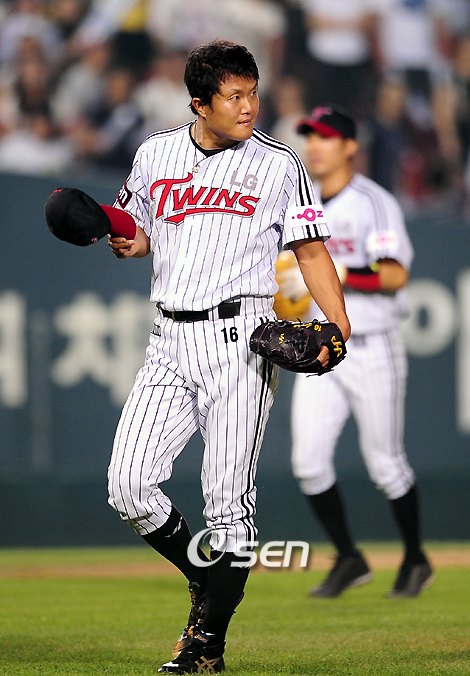 2009 프로야구 서울 라이벌 LG 트윈스와 두산 베어스의 경기가 5일 잠실야구장에서 벌어졌다. LG는 바우어의 6이닝 2실점 호투와 박경수의 솔로 홈런등 9안타를 내세워 투런 홈런 두방으로 따라온 두산을 5-4로 누르고 3연전을 모두 챙겼다. 1이닝 2실점을 하며 세이브를 거둔 이재영이 투구 내용이 불만스러운지 인상을 쓰고 있다./잠실=손용호 기자 spjj@osen.co.kr