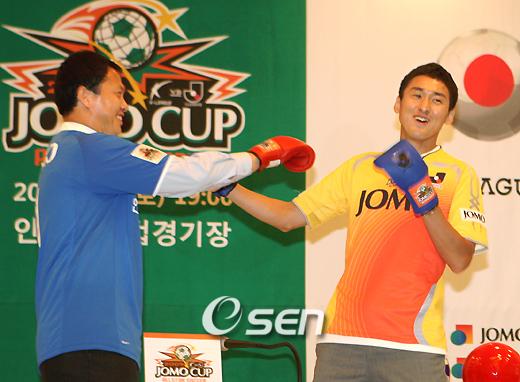 오는 8월 8일 인천월드컵경기장에서 벌어질 K-리그 올스타팀과 J리그 올스타팀의 2009조모컵 기자회견이 곽정환 k-리그 회장, 오니다케 겐지 j-리그 의장, 차범근 감독, 이운재 그리고 교토 상가에서 활약 중인 이정수가 참석한 가운데 6일 홍제동 그랜드힐튼호텔 서울에서 열렸다. k-리그 대표 이운재와 j-리그 대표 이정수가 글러브를 끼고 재밌는 포즈를 취하고 있다./손용호 기자spjj@osen.co.kr