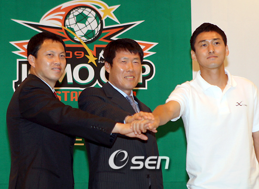 오는 8월 8일 인천월드컵경기장에서 벌어질 K-리그 올스타팀과 J리그 올스타팀의 2009조모컵 기자회견이 곽정환 k-리그 회장, 오니다케 겐지 j-리그 의장, 차범근 감독, 이운재 그리고 교토 상가에서 활약 중인 이정수가 참석한 가운데 6일 홍제동 그랜드힐튼호텔 서울에서 열렸다. k-리그 대표 차범근 감독,이운재와 j-리그 대표 이정수가 선전을 다짐하고 있다./손용호 기자spjj@osen.co.kr