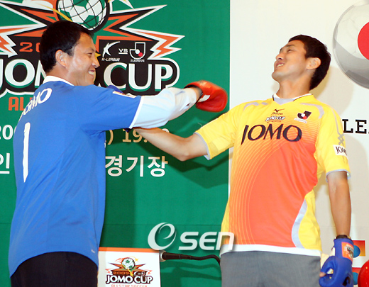 오는 8월 8일 인천월드컵경기장에서 벌어질 K-리그 올스타팀과 J리그 올스타팀의 2009조모컵 기자회견이 곽정환 k-리그 회장, 오니다케 겐지 j-리그 의장, 차범근 감독, 이운재 그리고 교토 상가에서 활약 중인 이정수가 참석한 가운데 6일 홍제동 그랜드힐튼호텔 서울에서 열렸다. k-리그 대표 이운재와 j-리그 대표 이정수가 권투 글러브를 끼고 재밌는 퍼포먼스를 벌이다 이운재가 가볍게 이정수를 치며 장난을 치고 있다./손용호 기자spjj@osen.co.kr