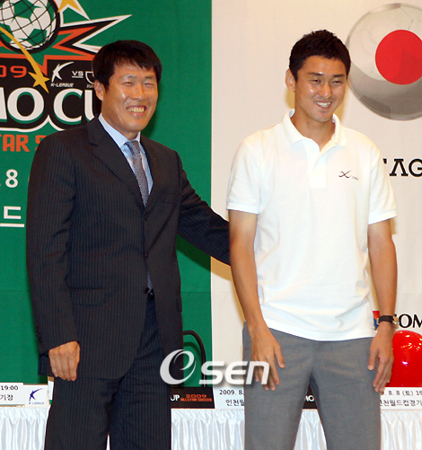오는 8월 8일 인천월드컵경기장에서 벌어질 K-리그 올스타팀과 J리그 올스타팀의 2009조모컵 기자회견이 곽정환 k-리그 회장, 오니다케 겐지 j-리그 의장, 차범근 감독, 이운재 그리고 교토 상가에서 활약 중인 이정수가 참석한 가운데 6일 홍제동 그랜드힐튼호텔 서울에서 열렸다. 차범근 감독이 j-리그 대표로 나오는 이정수와 활짝 웃으며 얘기를 나누고 있다./손용호 기자spjj@osen.co.kr