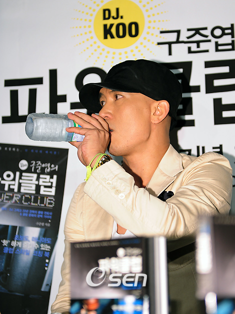 DJ.KOO(디제이.쿠)로 활동 중인 가수 겸 DJ 구준엽이 클럽 문화를 소개하는 책 'DJ.KOO 구준엽의 파워클럽'을 출간하며 7일 오후 서울 강남구 신사동의 자신의 클럽 '쿠바(KOOBAR)'에서 출간 기념 기자회견을 가졌다. 이 책은 그가 3개월간 주말마다 클럽을 직접 탐방하며 각 클럽의 스타일을 정리, 초보부터 마니아까지 자신의 취향에 맞는 클럽을 찾아가 즐길 수 있는 매뉴얼이며 이와 동시에 최근 클럽을 범죄의 온상인 듯 바라보는 부정적인 시각을 바로잡기 위한 기획물이다. 구준엽이 기자회견 중 물을 마시고 있다./민경훈 기자 rumi@osen.co.kr