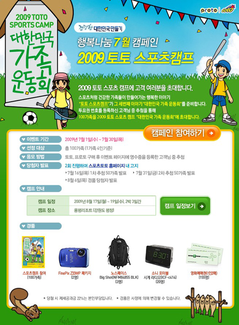 토토 스포츠캠프 '대한민국 운동회' 100가족 대상 모집…평창 용평리조트에서 개최 가족 단위 다양한 체험 프로그램…7월 30일 접수 마감 체육진흥투표권 수탁사업자인 스포츠토토(www.sportstoto.co.kr)가 토토 스포츠캠프를 개최한다. '건강한 대한민국' 프로젝트의 일환으로 올 여름 세 번째를 맞는 스포츠캠프는 '대한민국 운동회'라는 이름으로 스포츠팬들을 찾아간다. 이번 토토 스포츠캠프는 다음달인 8월 17일부터 19일까지 2박 3일의 일정으로 강원도 평창에 위치한 용평리조트에서 실시된다. 캠프 참가자들은 간단한 오리엔테이션을 시작으로 서바이벌 스포츠 퀴즈대회, 성인 및 어린이 스포츠 교실, 가족 운동회, 마술 공연등 다양한 프로그램들을 직접 참가해 활동하게 된다. 토토 스포츠캠프는 토토, 프로토를 구매한 후 이벤트 페이지에 영수증을 등록한 고객들을 대상으로 100가족(1가족 4인 기준)을 추첨을 통해 선발할 예정이다. 뿐만 아니라 스포츠캠프에 당첨되지 못한 고객들에게도 디지털카메라, 등산용 배낭, 포터블 시계 겸용 라디오, 영화예매권 등 푸짐한 경품도 제공된다. 또한 영수증 등록시 자동으로 행복나눔 캠페인에 건당 10원씩 자동 기부되어 응모를 통한 스포츠캠프 참가 행운을 얻을 수 있는 기회는 물론 스포츠 꿈나무들이 대한민국 스포츠의 미래로 커나갈 수 있게 도움을 주는 기금마련에도 동참하는 기쁨도 함께 누릴 수 있다. 응모 기간은 7월 1일부터 7월 30일까지이며 당첨자 발표는 1차-7월 16일(50가족), 2차-7월 31일(50가족) 등 2회에 걸쳐 있으며 스포츠토토 홈페이지를 통해 결과가 고지된다. 2009 토토 스포츠캠프 이벤트 페이지 '즐거운 스포츠, 즐거운 토토'(http://www.betman.co.kr)