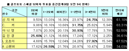 [골프토토] 골프토토 스페셜 52회차 투표율 집계…지정선수 5명 중 언더파 투표율 최고 신지애 언더파 61.10% 점쳐…오는 9일 밤 발매 마감 국내 골프팬들은 미국여자프로골프(LPGA) 투어 4대 메이저 대회인 US 여자 오픈에서 로레나 오초아의 맹활약을 점치고 있는 것으로 나타났다. 체육진흥투표권 수탁사업자인 스포츠토토(www.sportstoto.co.kr)는 오는 9일(목) 미국 펜실베니아에서 개최되는 LPGA 투어 US 여자오픈 1라운드를 대상으로 한 골프토토 스페셜 52회차에서 67.52%의 참가자들이 지난 코로나 챔피언십에서 우승을 차지한 로레나 오초아의 언더파 활약을 예상했다고 밝혔다. 상금랭킹 1위 신지애와 3위 크리스티 커, 2위 야니 챙은 각각 61.10%, 63.31%, 52.50%의 참가자가 언더파를 예상했다. 반면 스테이트 팜 우승자인 김인경(36.61%)과 맥도날드 챔피언십에서 5위를 기록한 안젤라 스텐퍼드(34.03%)는 1라운드 언더파 예상이 30%대에 그쳤다. 지정선수별 1라운드 예상 스코어는 신지애, 로레나 오초아의 경우 3~4언더파 예상이 각각 24.75%, 27.92%로 가장 많았고 크리스티 커(31.75%), 야니 챙(30.93%)의 경우 다수의 골프팬들이 1라운드 1~2언더파를 점쳤다. 김인경(25.60%)과 안젤라 스텐퍼드(26.95%)는 각각 3오버 이상, 1~2오버파를 예상했다. 스포츠토토 관계자는 "LPGA 4대 메이저 대회인 US 여자 오픈을 대상으로 한 이번 스페셜에서 국내 골프팬들은 상금랭킹 5위를 기록하며 올해 뛰어난 성적을 올리지 못하고 있는 로레나 오초아의 맹활약을 내다보고 있다"며 "2009년 LPGA 판도를 새로 써가고 있는 신지애, 김인경 등 한국 선수들이 이번 대회에서도 큰 파란을 불러 일을킬 지도 관심이 크다"고 밝혔다. 한편 이번 골프토토 스페셜 52회차 게임은 오는 9일 오후 6시 50분에 발매 마감되며 공식 적중결과는 10일 발표된다. '즐거운 스포츠, 즐거운 토토'(http://www.betman.co.kr)
