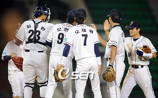'2009 CJ 마구마구 프로야구' 두산 베어스와 SK 와이번스의 경기가 8일 오후 잠실구장에서 벌어졌다. 두산은 5이닝 7피안타 무실점투를 펼친 선발 세데뇨와 친정팀을 상대로 2안타 1타점을 올린 유격수 이대수의 활약을 앞세워 8-3으로 승리했다. 승리를 거둔 두산 선수들이 마운드에 모여 승리를 자축하고 있다./잠실=윤민호 기자ymh@osen.co.kr