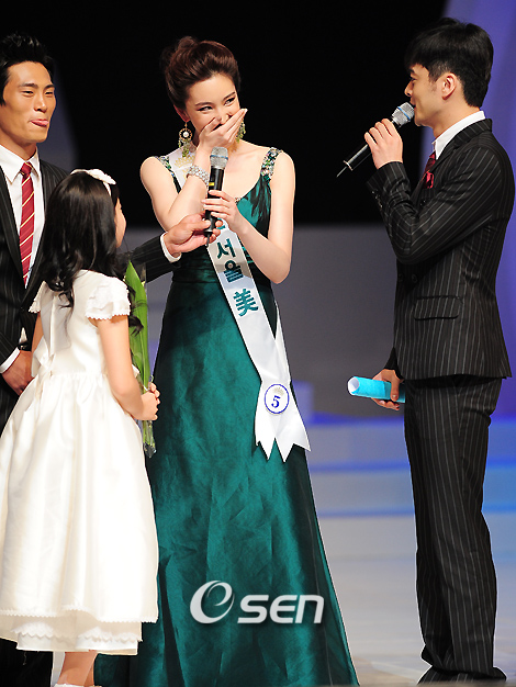 2009 미스코리아 선발 대회가 8일 오후 서울 종로구 세종문화회관에서 열렸다. 올해로 53회째를 맞는 이날 행사는 대한민국 최고의 지덕체, 진선미를 갖춘 미인을 뽑는 오랜 전통의 미인 선발 대회이다. 미스코리아 출신 탤런트 손태영과 방송인 이기상의 사회로 56명의 본선 진출자가 저마다의 장기를 내세워 자웅을 가렸다. 또한 인기 남성 5인조 댄스 크룹 '샤이니'와 3인조 보컬그룹 'SG워너비'가 초청가수로 무대에섰다. 이 날 김주리 (서울 진, 21세)가 진(眞)의 왕관의 주인이 됐다. 또한 선(善)에는 서은미 (대구 진, 21세)와 차예린(전북 진, 22)이 호명됐다. 미스코리아 미(美) 4명에는 미스경기진 최지희(22), 미스강원진 이슬기(20), 미스대전진 유수정(21), 미스서울미 박예주(21)가 뽑혔다. 나몰라 패밀리가 박예주(서울 미, 22세)에게 질문을 하자 박예주가 환하게 웃고 있다./민경훈기자 rumi@osen.co.kr