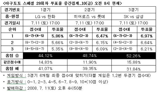 [야구토토] 대다수 국내 야구팬들은 오는 11일 오후에 벌어지는 2009시즌 국내프로야구 LG 트윈스-한화 이글스전에서 LG의 승리를 전망했다. 스포츠토토 공식 온라인 발매 사이트인 베트맨(www.betman.co.kr)은 오는 11일 오후에 펼쳐지는 LG 트윈스-한화 이글스, 히어로즈-롯데 자이언츠, SK 와이번스-삼성 라이온즈전 등 국내 프로야구 3경기를 대상으로 한 야구토토 스페셜 29회차 투표율 중간집계 결과 전체 참가자의 44.12%가 LG가 한화에 우세한 경기를 펼칠 것으로 전망했다고 밝혔다. 41.07%는 원정팀 한화의 승리를 내다봤고, 나머지 14.83%는 양팀이 같은 점수대를 기록할 것으로 예상했다. 최종 점수대로는 6~7점-4~5점으로 LG 승리(5.86%)가 가장 많았고, 6~7점-2~3점 LG 승리(5.66%), 6~7점-4~5점 한화 승리(5.35%)가 뒤를 이었다. 2경기 히어로즈-롯데전은 참가자의 48.74%가 히어로즈의 승리를 예상했고, 39.35%는 원정팀 롯데의 우세에 투표했다. 같은 점수대를 예상한 참가자는 11.90%로 나타났다. 최종 점수대로는 6~7점-2~3점으로 히어로즈 승리(6.47%)가 최다를 차지했고, 6~7점-2~3점 롯데 승리(6.15%), 8~9점-4~5점 히어로즈 승리(6.09%) 순으로 집계됐다. 3경기 SK-삼성전은 52.26%가 디펜딩 챔피언 SK의 우세를 전망했고, 31.84%는 원정팀 삼성의 승리를 예상하는 것으로 나타났다. 나머지 15.88%는 같은 점수대를 기록할 것으로 내다봤다. 최종 점수대에서는 6~7점-2~3점 SK 승리가 6.97%로 1순위를 차지했고, 4~5점-2~3점 SK 승리(6.64%), 4~5점-2~3점 삼성 승리(6.21%) 순이었다. 베트맨 관계자는 "국내 야구팬들은 주말에 펼쳐지는 LG-한화전에서 LG가 한화를 누르고 하위권 탈출의 교두보를 마련할 것으로 전망했다"며 "특히 이번 주는 많은 강수량 때문에 그라운드 사정이 좋지 않은 점이 변수로 작용할 수 있을 것"이라고 밝혔다. 한편 이번 야구토토 스페셜 29회차 게임은 첫번째 경기시작 10분 전인 11일(토) 오후 4시 50분에 발매가 마감된다. '즐거운 스포츠, 즐거운 토토'(http://www.betman.co.kr)