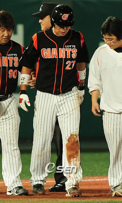 [OSEN=목동, 박종규 객원기자] 롯데의 포수 최기문(36)이 경기 중 가벼운 부상을 입고 교체됐다. 10일 목동구장에서 열린 히어로즈와 경기에 포수 겸 9번 타자로 선발 출장한 최기문은 7회 공격에서 선두 타자로 나서 볼넷을 골라 1루를 밟았다. 2루 도루에 성공한 뒤, 전준우의 유격수 땅볼 때 3루로 뛰던 최기문은 태그아웃 당했다. 이 과정에서 팝업 슬라이딩을 시도하던 최기문은 오른쪽 다리가 접히고 말았다. 아웃된 뒤 한동안 일어나지 못하던 최기문은 트레이너의 조치를 받고 일어나 더그아웃으로 향했다. 최기문은 오른쪽 허벅지 경련으로 인한 근육통으로 더 이상 그라운드에 나서지 못했다. 대신 장성우가 마스크를 썼다. '2009 CJ 마구마구 프로야구' 히어로즈와 롯데 자이언츠의 경기가 10일 목동 구장에서 벌어졌다. 7회초 무사 주자 2루 롯데 전주우의 유격수 앞 땅볼때 2루 주자 최기문이 3루에서 3루수 황재균에게 태그아웃 되며 부상을 입어 부축을 받으며 덕아웃으로 들어오고 있다./목동=민경훈 기자 rumi@osen.co.kr