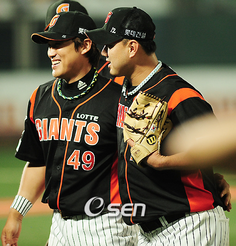 2009 CJ 마구마구 프로야구' 히어로즈와 롯데 자이언츠의 경기가 10일 목동 구장에서 벌어졌다. 이 날 경기에서 롯데는 홍성흔의 스리런 홈런과 선발 송승준의 완봉승 호투에 힘입어 히어로즈에게 3-0으로 승리를 거뒀다. 이 날 완봉승으로 송승준은 3연속 완봉승의 기록을 달성했다. 경기를 마치고 스리런 홈런을 날린 롯데 홍성흔과 3연속 완봉승을 거둔 송승준과 기쁨을 나누고 있다./목동=민경훈 기자 rumi@osen.co.kr