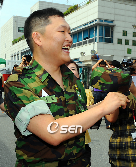 가수 싸이가 11일 오전 국방부 국방홍보원 홍보지원대에서 군생활을 마치고 제대하였다. 싸이는 지난 2003년 1월부터 산업기능요원으로 35개월간 군복무를 마친 뒤 부실복무 판정을 받고 지난 2007년 12월17일 재입대해 육군 52사단에서 근무하다가 올 1월부터 국방부 국방홍보원 홍보지원대 연예병사로 복무했다. 전역 신고를 한 싸이가 부대를 나서며 자신의 모자를 보여주고 있다./윤민호 기자ymh@osen.co.kr