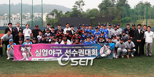 제1회 전국실업야구선수권 대회 개막식 및 본선 경기가 11일 오전 서울 신월야구장에서 열렸다. 한국실업야구연맹이 주최하고 한국야구위원회(KBO), 대한야구협회가 공동후원하는 이번 대회에는 실업연맹 2번째 대회로 소속 4개팀을 비롯해 직장야구팀 16개팀 등 총20개팀이 출전한다. 이중 16개의 직장인 야구팀은 지난 4일과 5일에 예선 토너먼트를 치른 후 홈플러스 게임데이, 경호자동차 쿨웨이브스, KBS, 다나와증권SMBC 카사노바 등 4개팀이 뽑혀 8강에 올라 11-12일 동안 시드배정팀들과 일전을 벌인다. 개막식을 마치고 선수와 감독 및 관계자들이 포토타임을 갖고 있다./민경훈 기자 rumi@osen.co.kr
